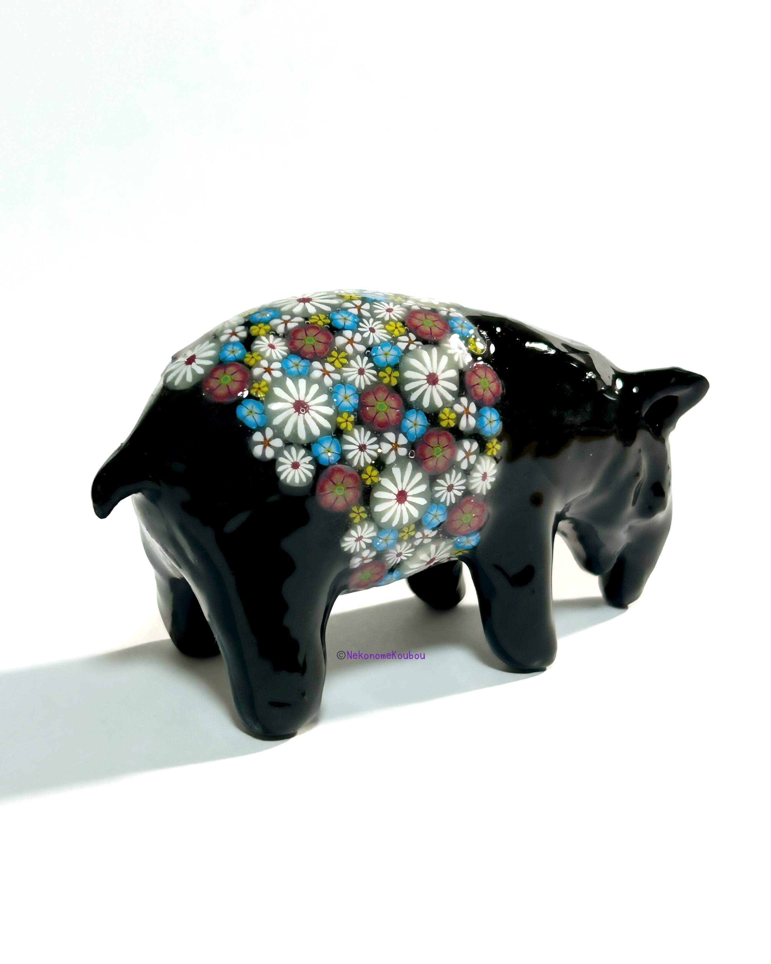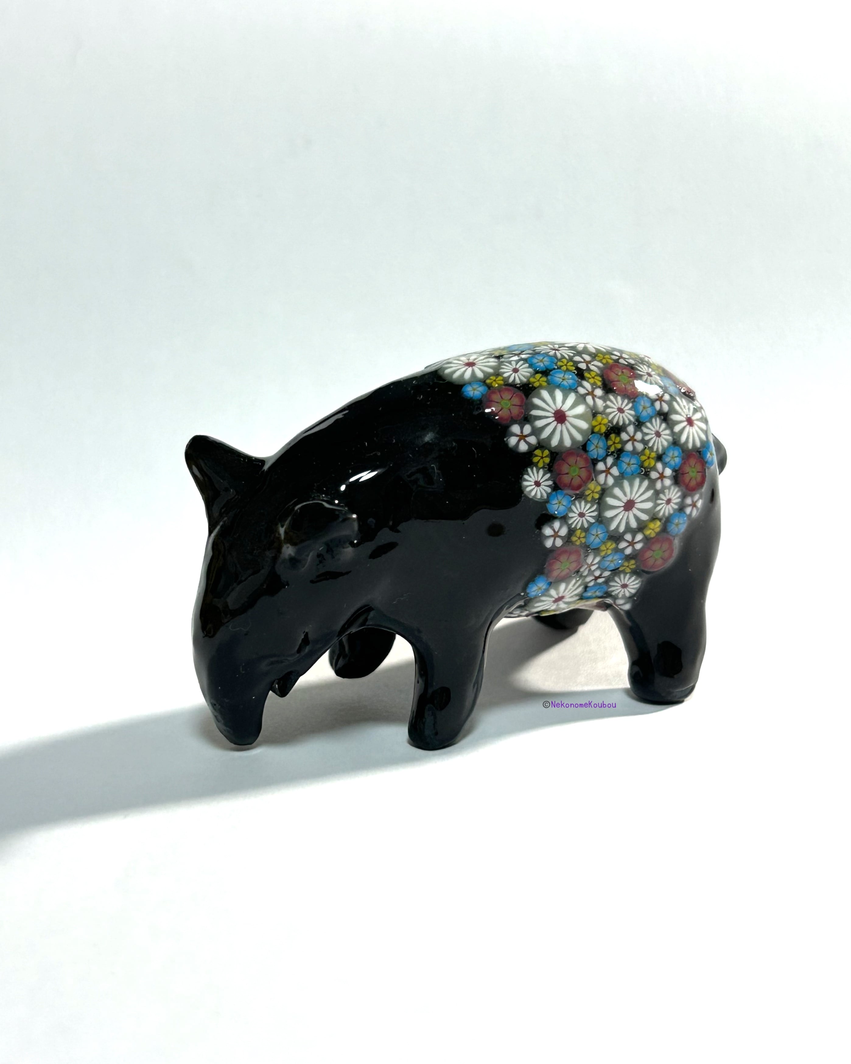 素材:オーブンクレイ(本体と体の模様細工)、透明レジン(本体コーティング)、ワイヤー(骨格)